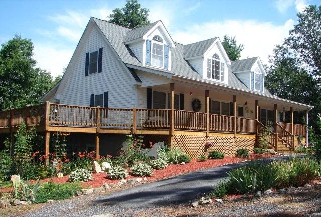 BEAUTIFUL CAPE COD - Master suite on entire 2nd floor with jetted tub and shower in the bathroom, and separate sitting area. Kitchen features oak cabinets and built-in wall pantry. Two bedrooms on 1st floor have their own baths (one is handicap-accessible). Gas log fireplace in living room provides warmth and a cozy setting. Full basement offers many possibilities to finish out or use as a workshop. Covered porches and deck are perfect to enjoy the views and to entertain. Two outbuildings, beautiful landscaping. Most furnishings negotiable at a reasonable price.