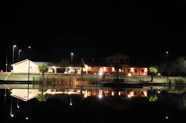 Located beside the house and adjoining the covered garage is the bunkhouse which has 8 bedrooms and 2 full large bathrooms with 2 additional baths. The back yard is a master planned entertaining area complete with a covered patio the length of the house with rocking chairs, overhead fans, a 10ft. B-B-Q pit and rocked grilling area all overlooking the awesome lake which spans for acres. The yard area is sprinkler irrigated and has been landscaped to compliment and protect the visual harmony of the ranch.