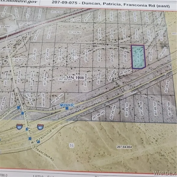 ACREAGE LIES ABOVE THE I40 AND JUST EAST OF FRANCONIA ROAD EXIT. MOHAVE COUNTY HAS INDICATED THAT A ZONING CHANGE PERMIT COULD BE SUBMITTED TO CHANGE THE ZONING FROM RA TO SOMETHING MORE SUITABLE TO THE AREA USAGE. BUYER TO SATIFY SELF AS TO THE ABILITY TO OBTAIN UTILITIES, FLOOD PLAIN AND ANY OTHER INFORMATION REGARDING THE USAGE OF THE PARCEL.