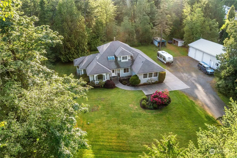 Welcome to your dream home! This meticulously maintained, custom-built gem sits on 5 private wooded acres in the coveted Meridian School District. Enjoy a spacious 3-bedroom layout with two extra rooms or offices. The main floor boasts a primary bedroom with a large ensuite bathroom, walk-in closet, and attached flex room. Stay comfortable year-round with central air conditioning and cozy up by the wood stove on chilly nights. Outside, a 3-bay shop includes a heated and insulated workshop area, perfect for projects. The fenced backyard features a large patio and ample space for gardening or play. Experience the perfect blend of quality, comfort, privacy, and convenience in this stunning property. Don't miss out-schedule a showing today