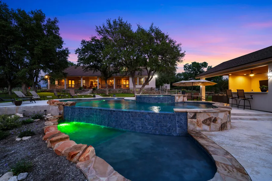 Outside, the back porch runs the length of the house, perfect for enjoying breathtaking Texas Hill Country sunsets. The inviting pool area includes a beach entry, spa, and a childrens splash pool. A well-equipped cabana features an outdoor kitchen with a grill, sink, ice maker, and refrigerator, plus a storage closet, offering the ultimate in outdoor entertaining.
