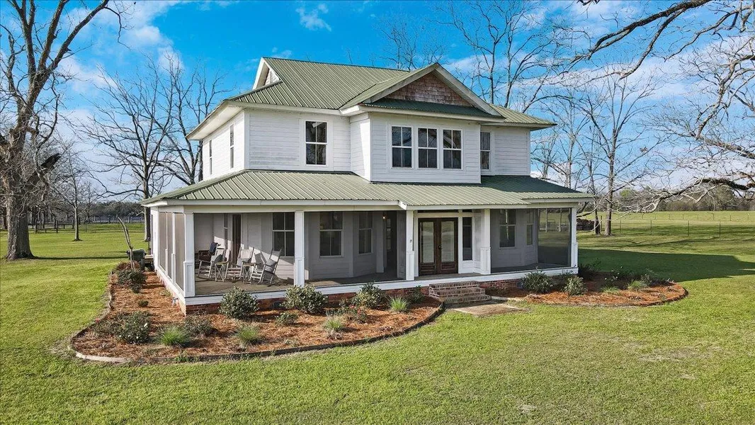 As you enter the main house through the fully screened front porch, you immediately notice the grandeur of the foyer with its soaring ceilings, intricate moldings, and rich heart pine floors. The spacious living room dining room combination features an antique cast-iron stove converted to propane and large windows that flood the room with natural light. The adjacent kitchen features beautiful cabinetry, a large center island, and a breakfast area that boasts views of the surrounding farmland. Step outside onto the screened-in back porch and relax on the swing bed while enjoying your morning coffee.