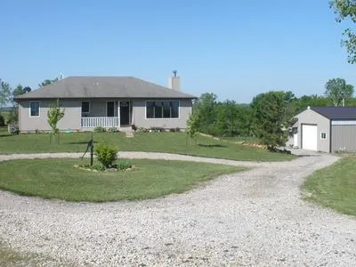 Very nice ranch home with an impressive great room on 4 acres m/l. Custom kitchen cabinets, breakfast bar, porcelain floor, fireplace, walkout basement with patio, covered deck, 40' x 30' shop with concrete floors. Fenced for horses. Located on black top road.