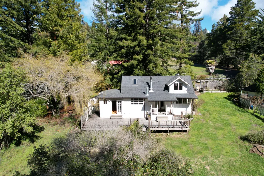 Unwind in this sunny oasis. Situated in a warm and sunny banana belt micro climate on approximately four level acres, set back on a private country road, this charming property offers a creative respite while being close to all the amenities of Point Arena and Gualala. Minutes from Anchor Bay’s amazing B Bryan Preserve, an endangered African Animal Preserve, restaurants, art galleries, and white sand beaches. Majestic redwoods surround grassy meadows, raised garden beds, a detached sleeping bungalow, a main house and a guest house. Ample acreage provides room for a family compound get away retreat or rental income. The main house and cottage are situated to provide privacy from each other, yet close enough to easily socialize. Magical Mendocino coast living. Two light-filled country style homes warmed by wood paneling, open beam ceilings, wood pane windows, stained glass windows, French ...