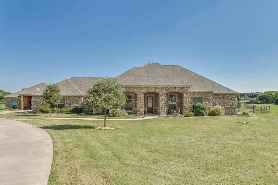 Wonderful Ranchette on 3.89 acres in Parker County! This 3724 sqft home is exceptionally crafted w crown molding, hand scraped wood floors, high ceilings & granite counters throughout. The open floor plan & gourmet kitchen allow for ease of entertaining large gatherings for friends & families. Take the party outside w your own backyard oasis. There is room for the horses too! 2 Stall barn w tack room. Conveniently located to covered arena.