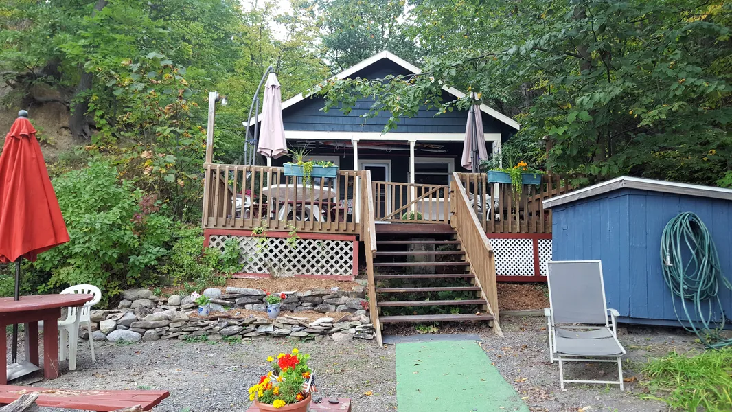 cottage w/open frame LR, brick fireplace, bedroom and sleeping loft.