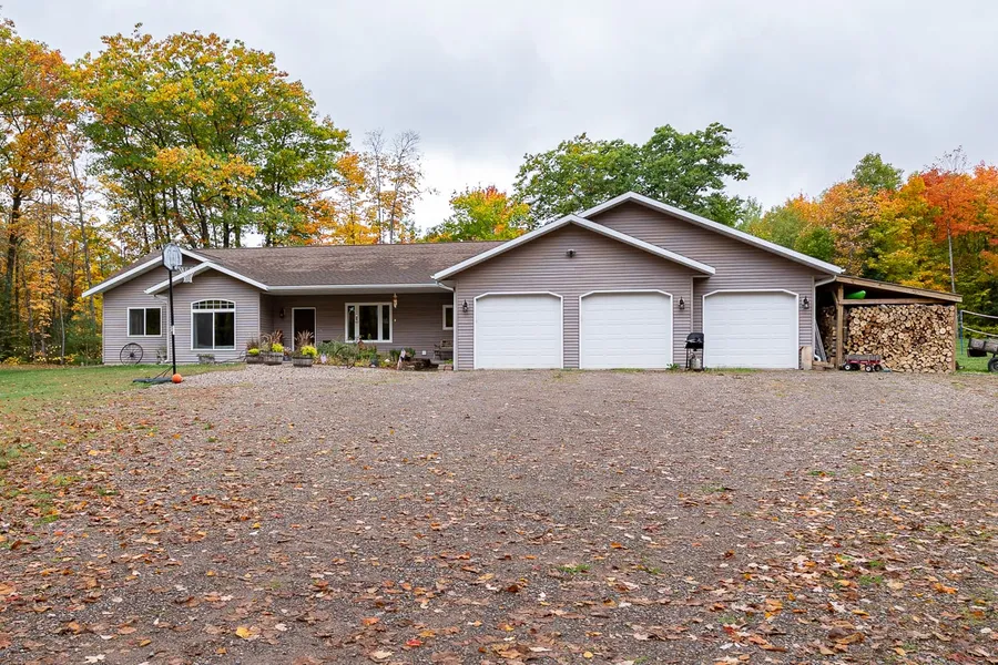 Nestled amidst 4 acres of pristine woodlands, this secluded 4-bedroom ranch home offers a tranquil retreat like no other. Surrounded by the beauty of nature, the residence boasts a captivating fieldstone fireplace as its centerpiece, creating a warm and inviting ambiance in the spacious living area while the open concept and large kitchen island are a focal point for gathering. Whether you're cozying up by the fire or taking a short walk to the beach on Wood Lake, this ranch home is a perfect sanctuary for those seeking the serenity of the great outdoors combined with the comforts of a well-appointed dwelling.