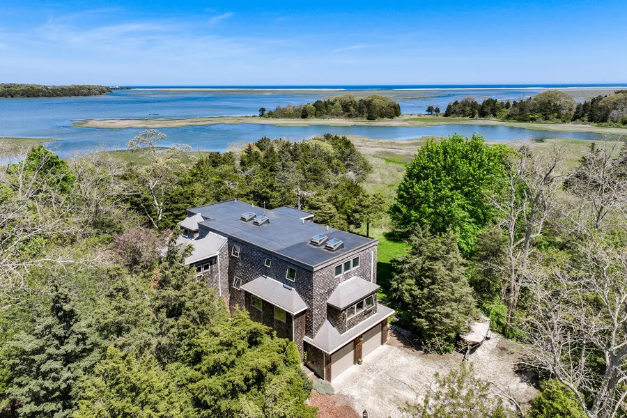 Panoramic views with contemporary flare and coastal charm make this distinctive Cape Cod property a rare find! Private with convenience to Orleans & Wellfleet! Nestled on an acre lot overlooking the mouth of Salt Pond Bay, barrier beach, and the ocean beyond. The property has every thought-out detail you will need including an elevator. The unique architecture of this home, built in 1996 by Sisson Homes, was designed with multiple decks, a screened-in porch, and sizable windows to drink up the sweeping views. As you enter, you are welcomed by an open concept of a modern multi-level house. The top level is all the common space, kitchen, family rooms, and cozy additional spaces capturing the views at every turn. As you move to the bedroom level, each room provides ample space, privacy, and upscale touches. The entry level has an inviting foyer, tons of storage, elevator entrance for ease to the upper levels, a laundry room, studio, and garage with EV hook-up. One can envision summer dinners and sunset boat rides with a short walk to the water to launch your boat, kayak, or paddleboard. This is a piece of paradise. Seller welcomes offers with requests for buyer concessi