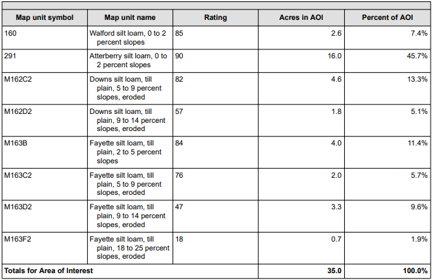 Primary soils in the tillable area are Atterberry and Downs silt loams. 79.9 CSR2 based on the Web Soil Survey site. See soil map for detail.