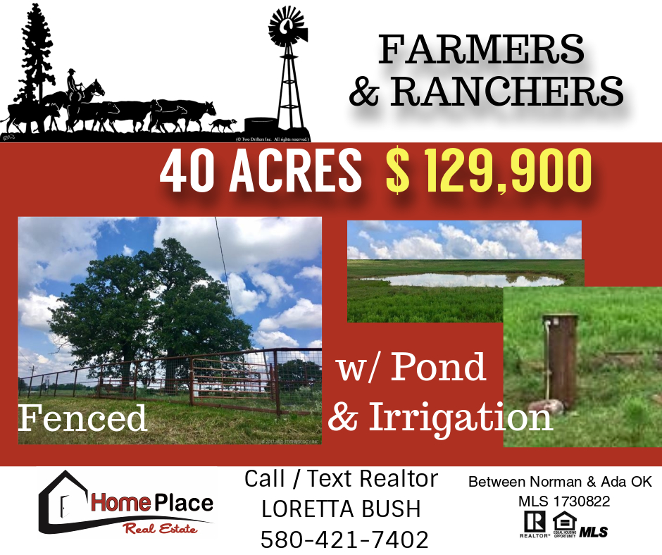 FARMERS & RANCHERS ... Bring your herd on over. 40 ACRES with POND (CORNER LOT). Between Norman and Ada OK. Corner of 59A & CR 3425. Fenced on 4 sides. 7-wire fence. Pecan trees, Irrigation well with submersible pump, also a home well. Irrigation well is approximately 55'deep and sits on an aquifer. MLS #1730822