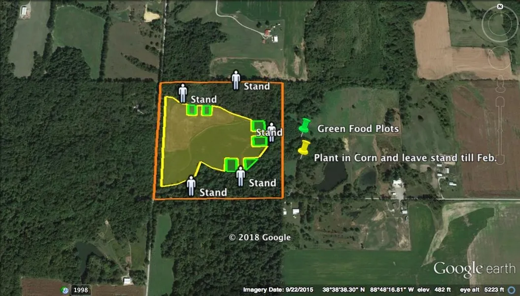One suggestion would be to have the farmer plant the tillable this year in corn and work out a better rate for him to leave it stand until February. Doing this would create bedding and food at the same time. The corn could then be mowed down in 4-6 spots for green food plots for different stand sites on different wind directions as you can see from the provided aerial map.
