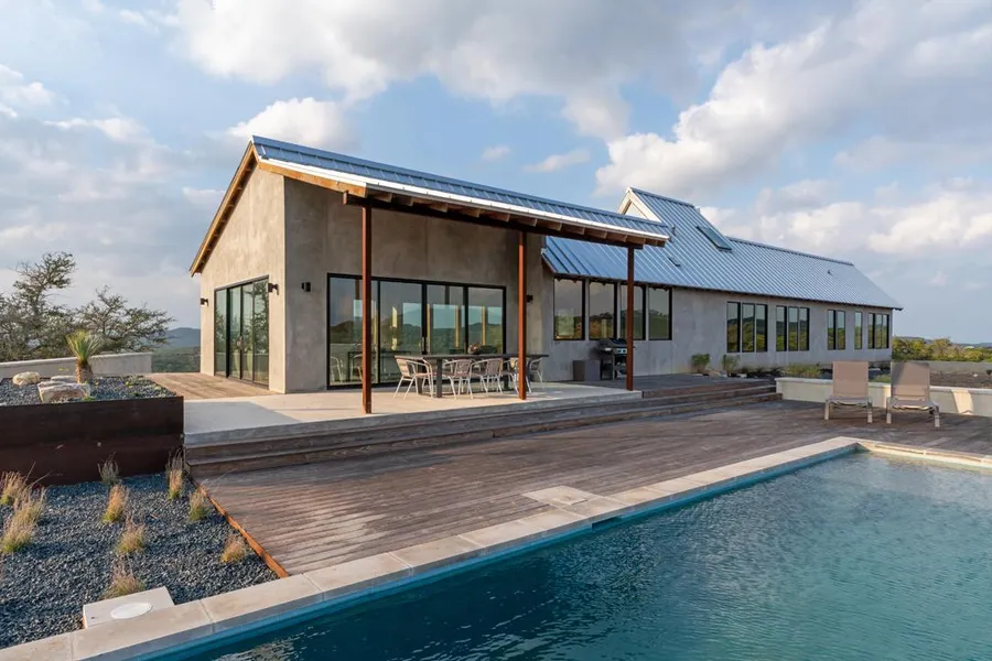 Newly constructed fully furnished contemporary home with breath-taking 360 degree views set on 40 acres of hill country beauty! Located in one of the most highly sought after areas in Blanco County! This stunning property has some of the best views Blanco County has to offer. Featuring natural landscape and timeless design, this tree lined property sits at the peak of the Middle Creek Crossing ranch properties. Explore the wooded acreage or sit by the pool with panoramic views enjoying mother nature at its best. The home has 4 bedrooms with 2 full bathrooms and a bonus loft space with a skylight. Natural light floods this open floor plan with extensive windows and slider doors to the exterior, bringing the outside in. Exquisite details include white oak cabinetry, a wood burning fireplace, stone counters and high end fixtures and finishes. The home can be sold fully furnished down to th...