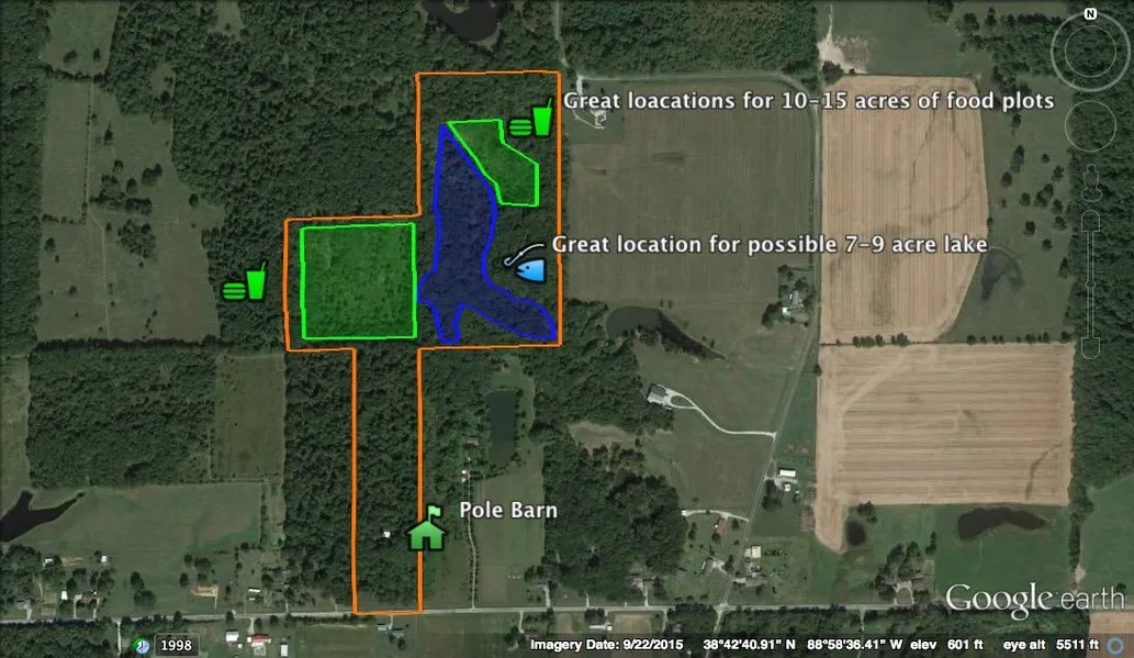 This 40 +/- acres in Southern Illinois has a great set up and hunts more like 60-70 acres than 40. The south 10 +/- acres has a little road frontage with a locked gate leading to a nice 30x40 pole barn that would be perfect to make a half cabin and half storage for equipment.