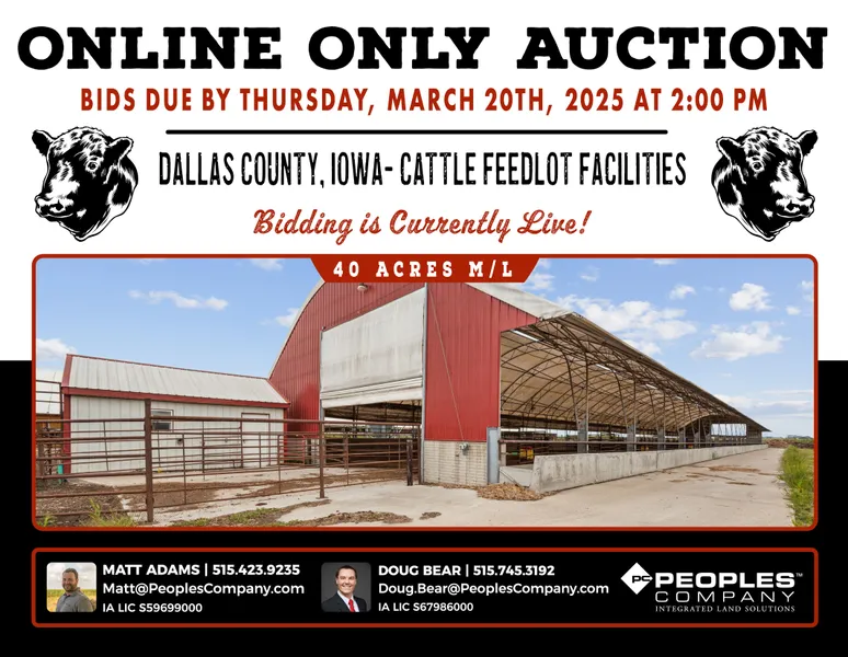 Online Only Auction for Central Iowa Cattle Feeding Operation - Bidding will conclude on Thursday, March 20th, 2025 at 2:00 P.M. CST! Peoples Company presents an opportunity to bid on a turn-key cattle feeding facility, several outbuildings, a residential dwelling, and high-quality tillable farmland acres situated on 40 acres m/l in northwest Dallas County, Iowa. All bidding will be conducted through Peoples Company's online platform and will be on a total price basis.