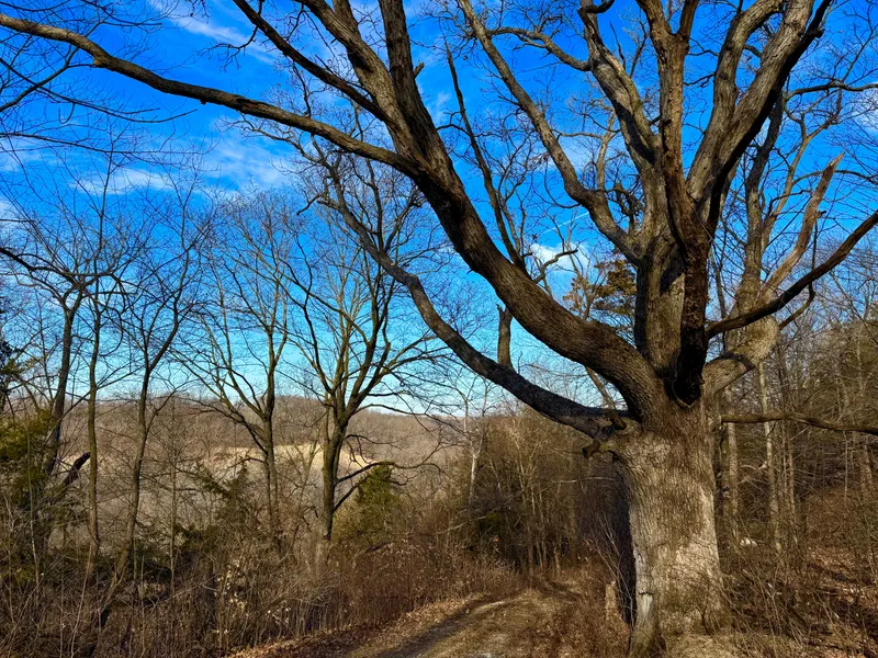 The property is split by the road, with unique features on both sides. On the West side, a network of trails navigates through hardwoods, including mature oaks, hickory, and young walnut trees, leading to a valley filled with...