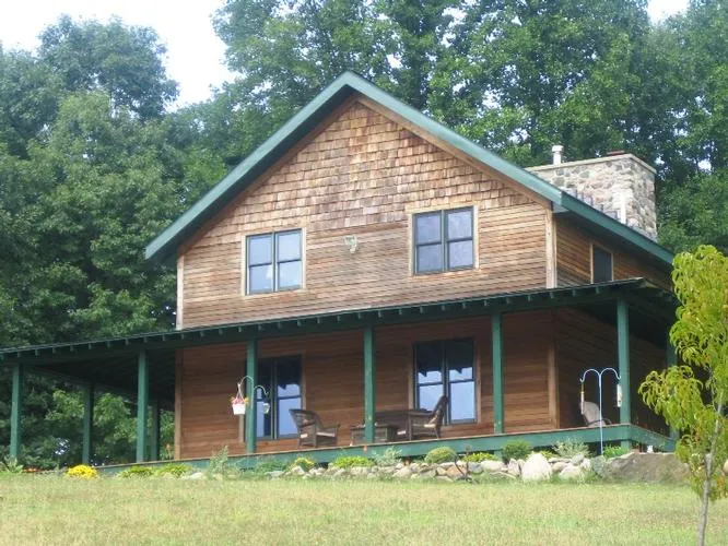 This secluded getaway home on forty wooded acres is a nature lovers dream as well as a hunter’s paradise. With over 150 feet of covered porch you can almost touch the hummingbirds as well as many other species of birds as they feed within arm’s length. The second largest turkey taken in Michigan was harvested here. Trophy deer in the 168 plus class have been harvested here as well. With a mixture of apple, peach and a variety of trees, a year round stream with bridge, thick cover, and many farm crops in the area make this a hunters dream come true. This energy efficient house is constructed of batten kiln timber, Murius insulated panels, 100 year shingles, R-68 ceilings and R-54 walls, and a majestic cut stone masonry fireplace with wood insert. View nature out of the large glass windows in the vaulted living room. The large upper level loft has open ceilings and can be your recreation ...