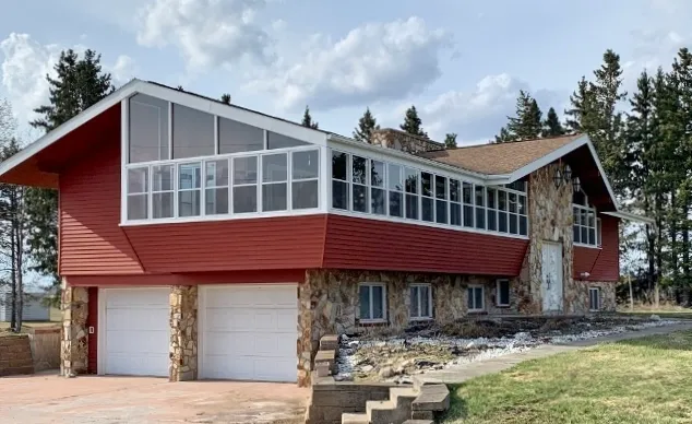 40 beautiful acres - Home is a Showcase Architectural Design that allows maximum light throughout home. Custom crafted fireplaces in living room & family room. Grand split entry foyer with open stairway. Solid cherry kitchen cabinetry & Jenn-Air appliances, dining room & formal dining room. Intercom & radio system throughout. Numerous built-ins. Geothermal heat & AC. 3 wrap-around 3 season porches with all new windows/screens. 5BR/3BA, master BR has walk-in closet and private access to west deck. Lower level walkout basement with large family room & fireplace - plus hot tub. New backup propane furnace installed. Convenient tuck under insulated double garage. Garden/work shed with AC. 40x80 steel shed & more! Large established raspberry patches & crap apples.