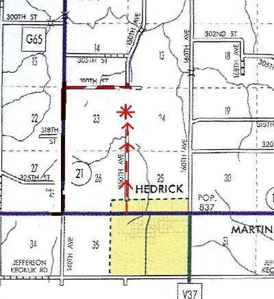 Research Parcel InformationFrom junction Hwy 149 & Lake St (aka 150th Ave) at W edge of Hedrick: N 1.5 mi on Lake St (150th Ave); SE corner of famr on W side of road across from house #31214.