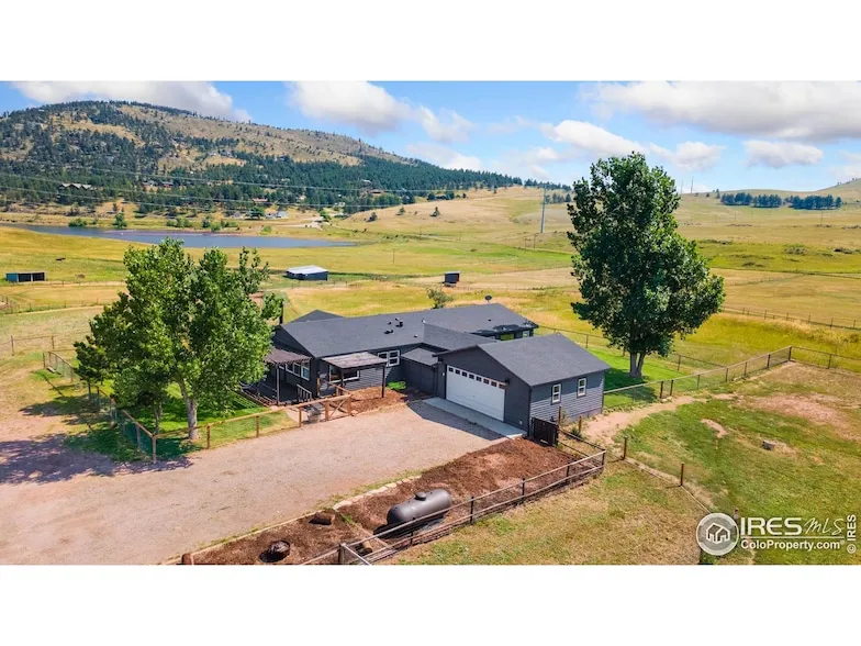 !!! listed $75,000 below apprised value (instant equity)!!! Exceptional 40-acre equestrian property with stunning Longs Peak views and direct access to Pinewood Reservoir. Watch elk herds migrate through your backyard or enjoy fishing and kayaking steps from your door. Turnkey horse facilities include a 96x40 barn with 10 stalls, 2 foaling stalls, tack room and wash bay. Additional 7-stall barn, 3 run-in sheds, dual arenas, and multiple fenced pastures with professional-grade fencing. Hay storage and dog fencing included. Recently updated ranch home features gourmet kitchen with SubZero refrigerator, Viking microwave, and quartz counters. New flooring, updated bathrooms, fresh paint, and newer roof and windows throughout. Primary suite has custom shower and walk-in closet with built-ins. Large entertaining decks showcase mountain views. Attached 2-car insulated garage provides ample storage. Located 20 minutes from Berthoud and Loveland, near Carter Lake recreation. Property borders generational family ranch and national forest land, ensuring privacy and preserved natural setting. Flexible floor plan includes non-conforming bedroom that can serve as den. This rare Rocky Mountain horse property combines luxury living with world-class equestrian facilities in an unmatched natural setting. A truly special property!