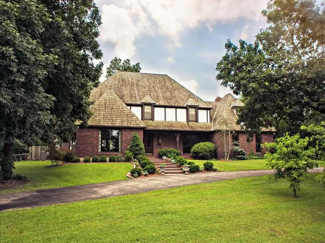 Hundreds of tall oaks and hickory trees surround this Tudor style home. Large rooms with lots of windows to enjoy the view. Hardwood floors, brick floored sunporch, large kitchen with 8 foot island. Formal dining, breakfast room and 3 wood-burning fireplaces. French doors, picture windows...2 recently installed Lennox heat pumps for efficient zoned heat/cooling. Finished basement with second kitchen. 2 acres fenced-in backyard, and cross fencing on 30 acres of pasture. Easy access at mile from highway on paved road. Tons of storage, cabinets and closets. Third car detached garage with loft for more storage.