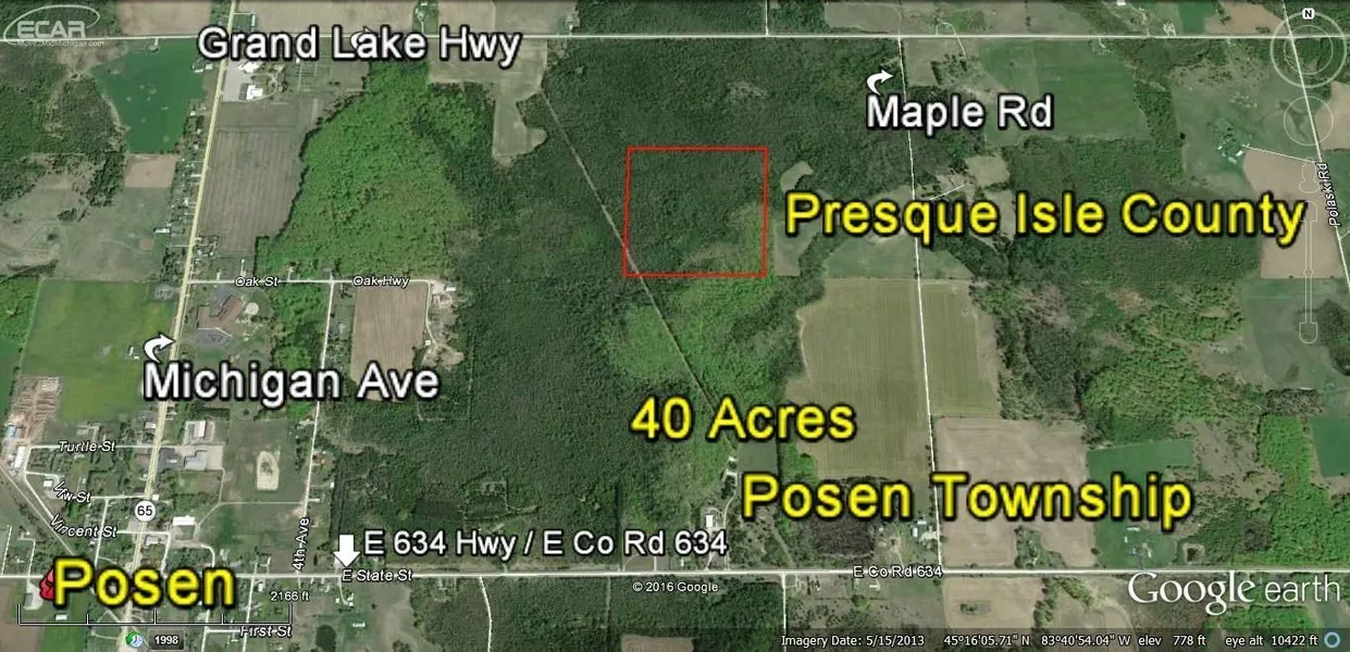 40 acre nicely wooded property located 1/4 mile off Maple Lane, 1/4 mile off Grand Lake Hwy., Posen Township. Property is currently landlocked, 95% wooded. Great hunting property. Potential for a larger parcel to make 80 acres with adjacent properties.