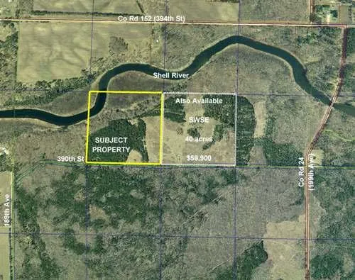 Priced below the county's estimated land value! Beautiful 40 acres with approximately 640 feet of Shell River frontage. Located northeast of Menahga within Huntersville State Forest. The gently rolling terrain is mostly wooded with mix of Red Pine and Jack Pine, young Spruce and Aspen, and 79+ year old Swamp Hardwood. Excellent waterfowl, upland bird, and big and small game hunting area. Hundreds of acres of public land across the road. Additional land also available (MLS# 201952).