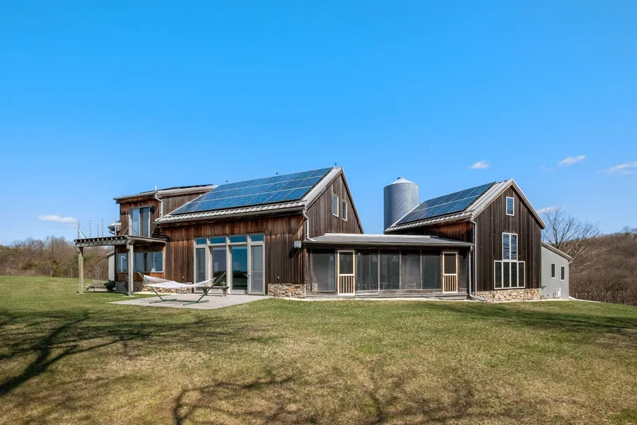 Why do so many houses built in the country look like they belong in the suburbs? This contemporary interpretation of an old-time farmstead with silo is like nothing else on the market. A work of art designed by award-winning architect Barbara Mullenex, AIA, to bless one particular hilltop in Washington County, Md., "The Oaks" is a hushed retreat for anyone who will never tire of catching glimpses of wildlife from 56 mountain-view windows and listening to rain on the metal roof at night.One decompressing hour's drive from downtown DC, its 40 acres of field and forest and 60-mile view are forever protected against further development by Maryland's "rural legacy" program. Maintenance of all major trees, including more than 50 dogwoods, is chronicled with a data base. A once-productive peach orchard site promises a natural microclimate for grapes. You'll be close to the trains of MARC, the restaurants of Shepherdstown, and the walking paths of Antietam National Battlefield--plus a profusion of Civil War sites.But why go anywhere when the sunset changes every evening from two patios and a balcony? When Eastern Bluebirds swoop low over the stocked pond for dinner on the wing? When the wine cellar cradles climate-controlled vintages? When a neighboring farmer handles outside chores in return for grazing rights.Don't let the deliberately weather-beaten look fool you. Built new to Mennonite standards in 1998-99, all kitchen, bath, laundry and HVAC appliances are modern. Three bedrooms, three baths, private office, 2600 square feet. Two-car garage. From rooftop solar to radon remediation to senior-friendly fixtures to sound system to outdoor shower stall, you'll find almost everything. No bidet. Sorry.