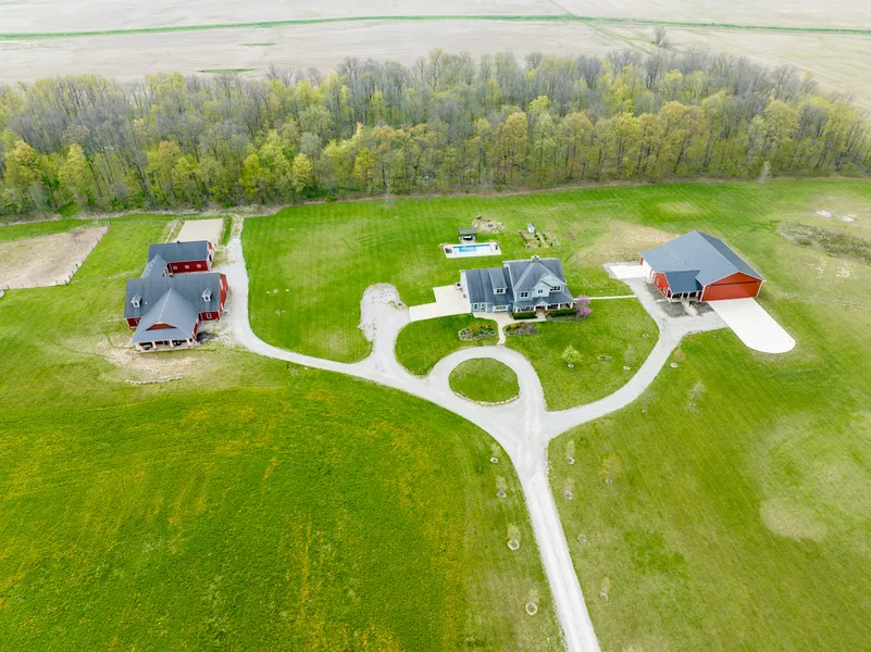 Secluded farmhouse-style home and guest cottage built by Arbor Homes sitting on 40 Acres - in-ground pool w/auto cover & gazebo -1200 sq. ft. guest house is connected to the barn & has hickory wood floors, granite counters in kitchen, 2 BR, 1.5 baths & open concept - large metal pole barn w/walk up attic & 2 overhead doors to store large equipment - separate 4-stall horse barn is complete w/2 12x12 stalls w/automatic waterers, access doors for horses to a large fenced paddock w/pea gravel & third automatic waterer, 2 smaller stalls for minis or smaller livestock, feed room, tack room, wash bay, drain, heated water & walk-up hay loft - 2 fenced pasture fields at about an acre each - 10 acres are planted w/50/50 alfalfa & pasture grass, 5 acres towards front of property is Pheasants Forever & the 5 acres around the home is maintained & mowed - inside, the main home has above ground 5,292 finished sqft & a 2,500 sqft finished basement (completed in 2019) w/custom kitchen, bath & workout room - the master is on the main w/a large bath complete w/walk-in tile & stone shower, clawfoot garden tub, massive master closet w/island & built-in speakers - the open kitchen is highlighted by a wood burning high efficiency stone fireplace, a Wolf double range, a double Sub-Zero refrigerator, granite countertops, two sinks (one copper sink in the island) & butler's pantry - the kitchen is open to the great room & has built-in bookcases & speakers - private office/den area just off of the great room - the pine wood floors in the main level are directly from a Georgia sawmill - the main level is completed by 2 mudrooms and a large laundry room - the upper level houses 4 bedrooms & large rec room - 2 of the bedrooms have their own full bath while the other 2 share a J/J - 3 of the 4 bedrooms have walk-in closets - additional features of this home include a closed-loop geothermal system w/3 zones, real stone throughout the home, built-in speaker system, fresh paint in 2016, 2 wells, 2 septic systems a garden and raspberry patch—Newer 5209 sqft heated recreational outbuilding 56' x 72' w16'x40' electrohydrolic Powerlift door, 2 car garage, lounge area, built-in cabinets, kitchen area w/granite tops & appliances, 1/2 bath, fireplace, heat & A/C.