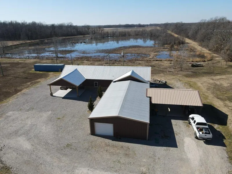 I am not a fan of cliches and "you must see it to believe it" is one that can certainly be overused. However, the custom woodwork in this lodge makes that a true statement and the pictures cannot capture it all. Much of the custom wood is from Oaklawn Racing with some being from local equine facilities prior to demolition. Much of the trim work was done by an onsite mill from a few oak trees on the property that were knocked down in a windstorm. Live oak edges are not uncommon, but going through the detail to make live oak edge shelving within master closets is rare. The lodge consists of 4 master bedrooms (each has a full bath within) and 3 additional bedrooms. The Great Room is meant for entertainment and features a large bar area and its' own oversized restroom area. Exterior measurements of lodge equate to 4,190 ft2 of heated and cooled space which includes a heated and cooled shop area for side by side/boat storage. LODGE IS SELLING FULLY FURNISHED AS PICTURED (only the ranger and one striped bass mount are leaving). The container pictured also conveys along with dozens of decoys inside. The 40 +/- acres that the lodge sits on has been getting better every year since the seller began development 5 years ago. It is primarily used to watch mallards in the evening while enjoying dinner/drinks, but 2-3 excellent hunts took place in 2021-2022 hunting season. The timber was leveed in 2021 and floods from the same well as the field/moist soil unit system. While it is common sense this 40 alone will not sustain the whole camp day in/day out, you do not have to look far in any direction to find out that you are in good company of high-quality clubs focused on waterfowl management which means plenty of traffic in the area to supply the property for selective hunts throughout the year. The camp is all electric and had a new septic installed in 2021. For more information contact Broker Kevin Keen at (870)215-1185.