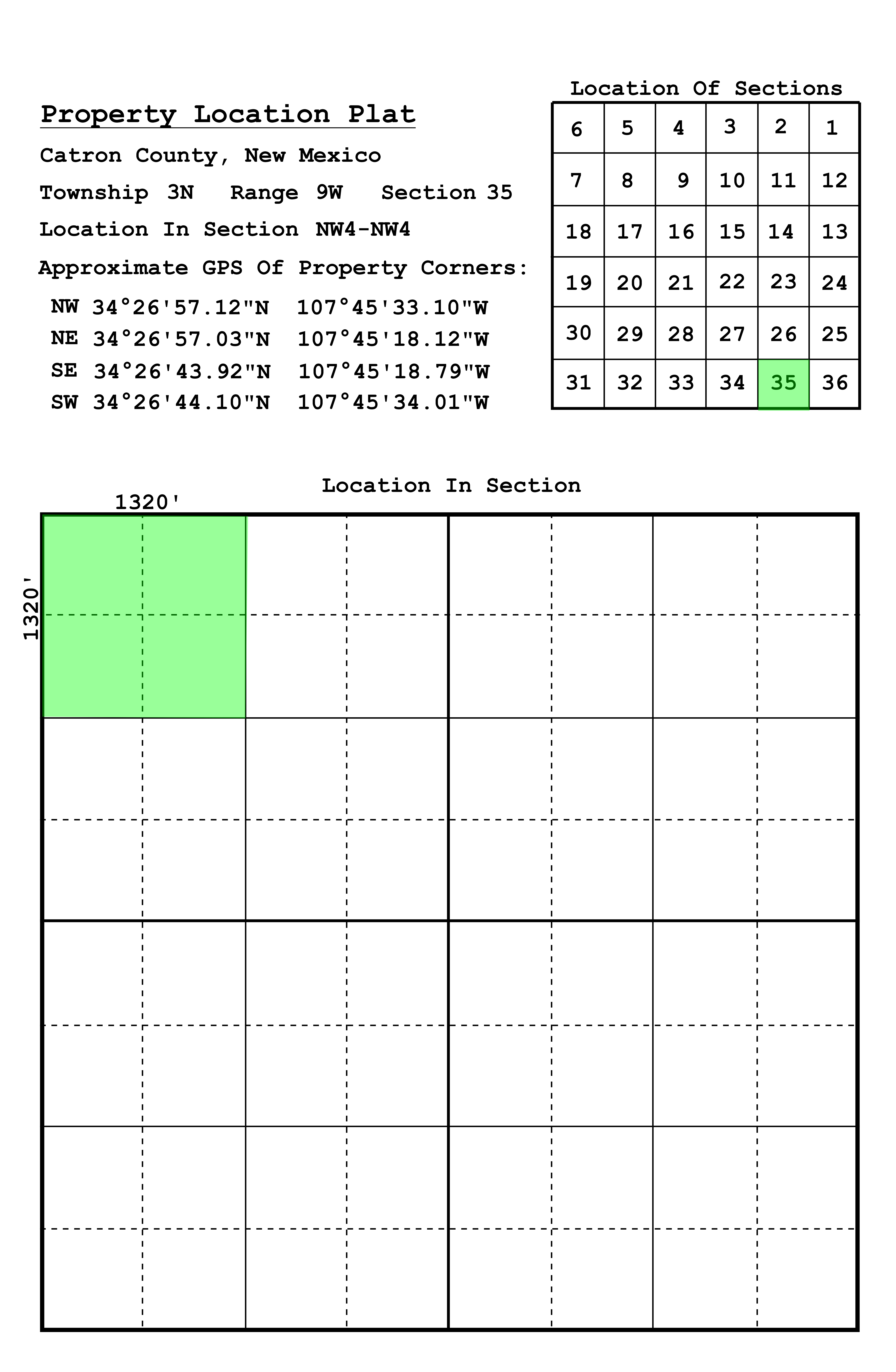 This property is the Northwest Quarter of the Northwest Quarter of Section 35 in Township 3 North, Range 9 West, Catron County, New Mexico.