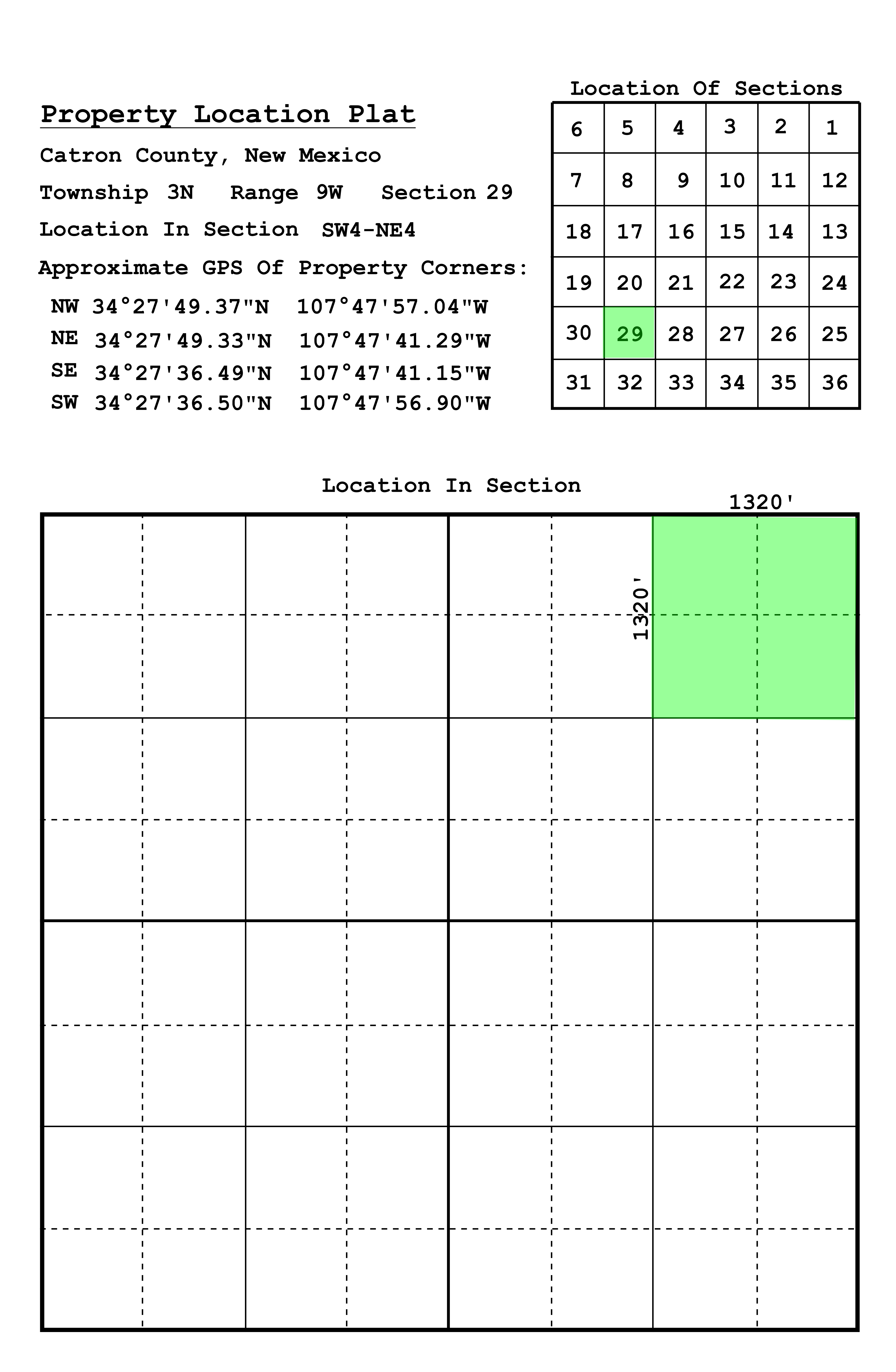 This property is the Northeast Quarter of the Northeast Quarter of Section 29 in Township 3 North, Range 9 West, Catron County, New Mexico.