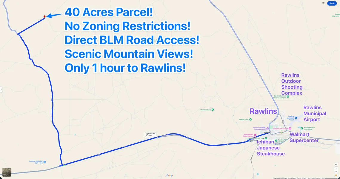 The property is approximately 20 miles (about an hour drive) to Rawlins, Wyoming, which has shopping, fuel, hotels, and restaurants for the area. Rawlins also has a Walmart Super Center and multiple mechanic shops. This tract also lies approximately 37 miles to Wamsutter, Wyoming, which also has some shopping, eating and gas stations. The tract includes a section of a seasonal lake, Mud Springs Lake, which provides a private opportunity for some water sports and gives the owner a lakeside lodge experience.