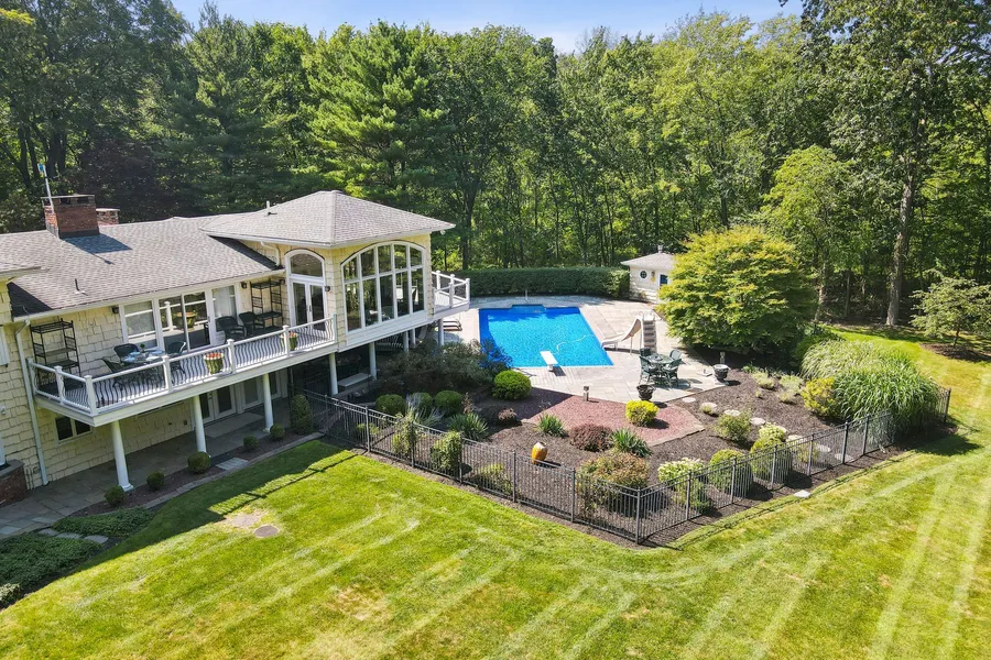 LOOK NO FURTHER! Nestled on over 7 acres of picturesque landscape, this exceptional custom home epitomizes luxury living in every detail. Boasting a stunning MOTHER/DAUGHTER suite on the ground level, complete with a cozy living room, fireplace, two additional rooms, two baths, and a brand-new kitchen with modern appliances, this residence offers versatility and comfort. The main house welcomes guests with a grand foyer leading to three spacious bedrooms and four luxurious baths, including a gourmet kitchen outfitted with high-end appliances, custom cabinetry and granite countertops. Elegant living and dining rooms feature breathtaking views of the meticulously manicured grounds, while the great room dazzles with vaulted ceilings, a wet bar, and walls of windows overlooking the large heated, inground pool and wraparound deck. The conservatory beckons relaxation with heated floors and scenic vistas, leading to outdoor dining on the covered patio by the pool. Custom cabinetry adorns the laundry area and mini bath, while the attached heated and air-conditioned 2-car garage provides convenience and storage. For car enthusiasts, a separate 3-car garage with alarm system and heat, offers ample space, while a cottage gym ensures year-round fitness. This rare, one-of-a-kind home exudes sophistication and charm, perfect for those seeking an unique retreat for both living and entertaining. Town has home listed as 3 BR septic. Former owner expanded system, town has no records on file.