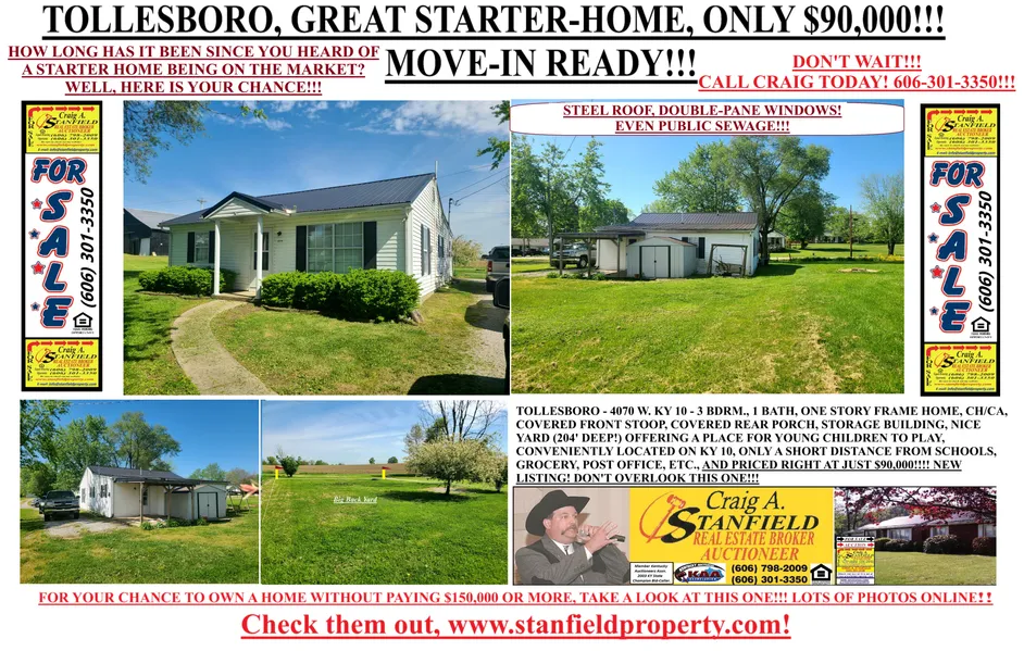 TOLLESBORO - 4070 W. KY 10 - A TRUE STARTER HOME! How long has it been since you've heard that phrase! Looking at buying your first home and don't want to borrow $150,000? HOW ABOUT THIS ONE FOR $90,000!!! Offering 3 bdrms., one bath, CH/CA, steel roof, double-pane windows, covered front stoop and rear porch, large back yard, conveniently located close to school, post office, grocery, AND ON PUBLIC SEWAGE (plus water, gas, and electric!)!. Don't overlook this one and don't wait too long OR IT WILL BE GONE!!! C3302