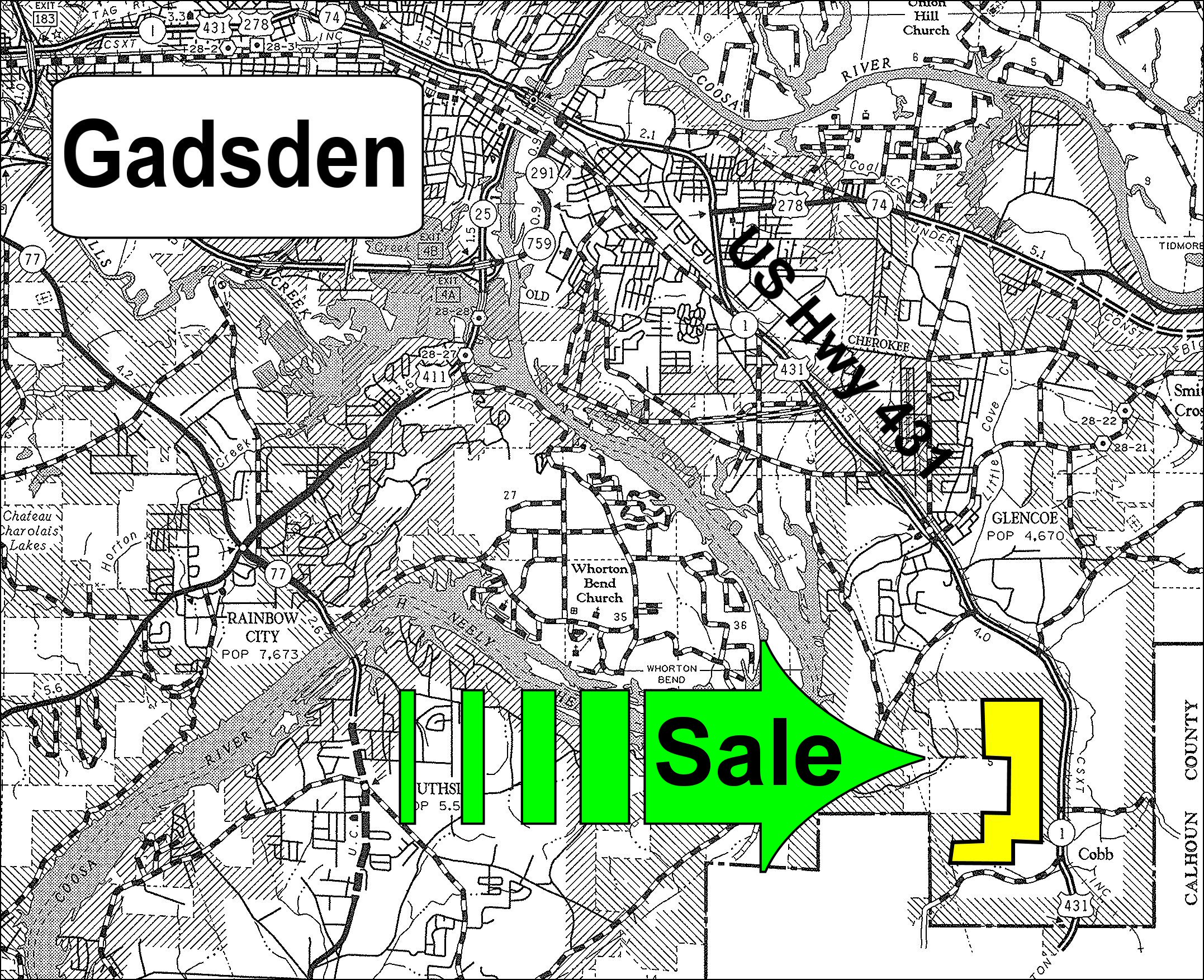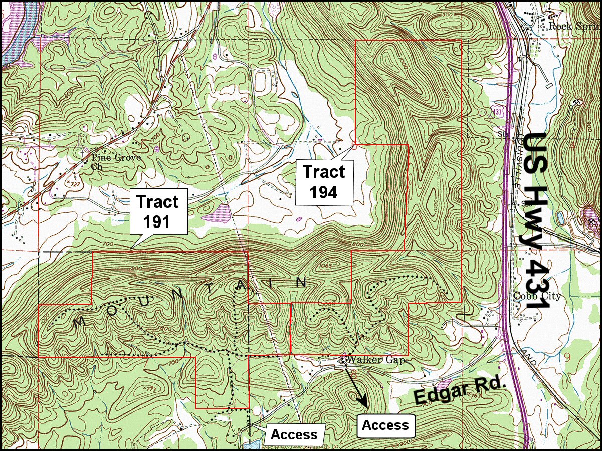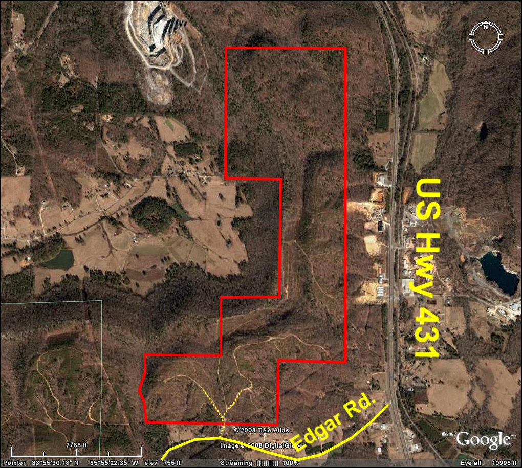 Research Parcel InformationFrom Interstate 20, take Anniston Exit (US Hwy 431 North) and go north through Anniston on Quintard Ave. Go 6 miles to split of US 431 and AL Hwy 21, and bear left staying on US 431. Go 17 miles crossing into Etowah County to the intersection of Edgar Rd on the left. Take a left on Edgar Rd. and go 2/10 of a mile to a driveway on the right. Take a right and go uphill past the house to a white gate that is on the property line.