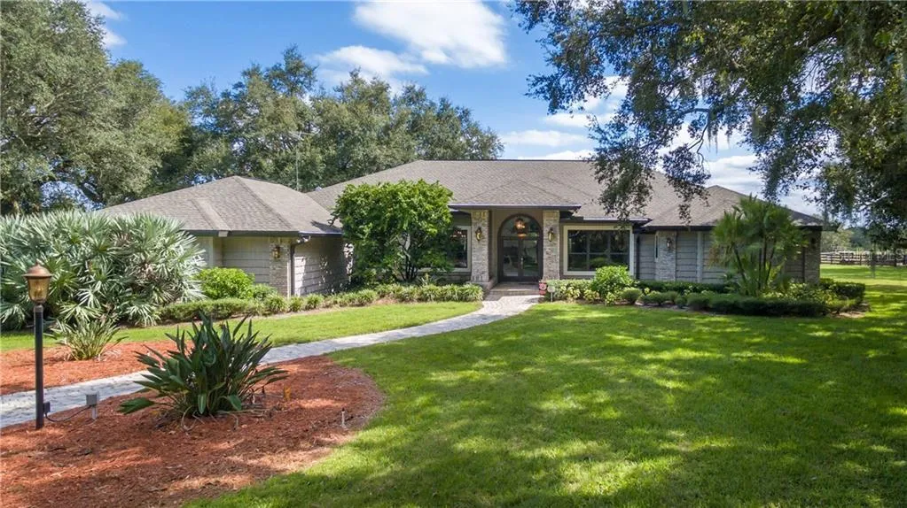 Welcome HORSE country, bring your horses, cows, chickens and other livestock to this beautiful property and live in this gorgeous home surrounded by nature. Enter through the gated entrance with granfather oaks on both sides of the driveway. As walk the paver sidewalk to the entrance, you see the custom etched glass doors French door entrance opening to an expansive and open spacious floor plan with large windows that provide a 360-degree views of the lovely property. Nestled among large oak trees, this property is great for entertaining and hosting parties. You will love all the space to run and play. The over-sized pool area can host the largest parties along with cooking in the outdoor kitchen on the new gas grill and double side burner. There are two gas fireplaces which provide not only ambiance, but heat in our rarely cool winters. The kitchen is large and open with quartz counters...