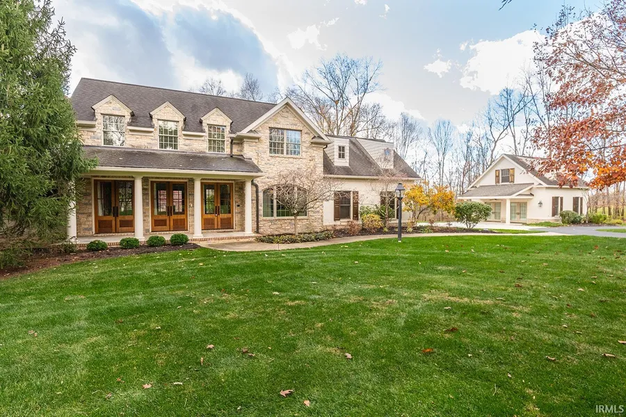 Exquisite Estate with Luxury Finishes and Guest House. The epitome of elegance nestled on 1.85 acres. 5 bedrooms, 5 full and 2 half bathrooms with unparalleled craftsmanship by Irongate Fine Homes. Cathedral, solid wood beamed ceilings, 2 fireplaces, white oak hardwood flooring, custom draperies and wood shutters throughout. Gourmet kitchen with custom solid stone countertops, brick backsplash, spacious island, three sinks, dual dishwashers, a Wolf range and hood, Sub-zero wood front refrigerator, under cabinet lighting and a mini refrigerator in the walk-in pantry. Opulent primary suite with vaulted ceiling, private dressing room, dedicated laundry room, spa-like bathroom complete with twin vanities, tiled shower + soaking tub. Upper level includes a loft, three generous bedrooms (two with en suites), and a second laundry room. Expansive lower level walk-out offers over 1,000 finished and 2,000 unfinished square feet. Meticulously landscaped grounds, and a guest house with matching finishes and quality.
