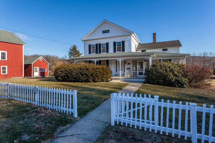 Listed on the CT Historic Register, the home was built 1851 by Milton & John Curtiss who established a successful farm. The remarkably well-preserved farmhouse, together with the intact historic setting of open fields and A+ barns is a truly exceptional property with great investment potential or a country retreat. The barns have been well preserved which add to the property and make them architecturally significant as a Grand Revival style house. The house features a large kitchen with a commercial range and granite counters. Everything is up to date without having destroyed the integrity of this historic property. The outside amenities are superb with a large screened in porch, a patio area overlooking a formal garden and the orchards featuring apples, pears, raspberries and two beautiful chestnut trees providing shade for the backyard. It is situated on 42 acres to explore, great for hiking and cross country skiing. There is a swimmable pond and a gorge with a waterfall. The town beach is 1/4 mile away and has a lifeguard and picnic area. The home has a long standing rental income through AirBnB with reviews and bookings year round.