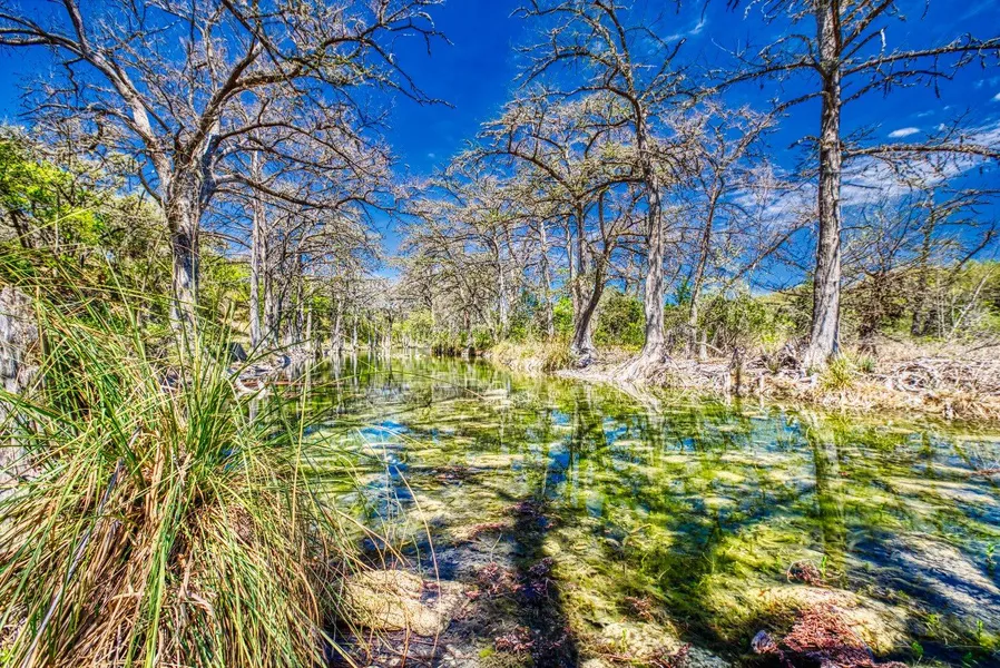 Majestic Cypress trees line this park like setting with coke bottle clear water, the vegetation that surrounds includes many varieties of oaks creating a peaceful serene haven. There's a seasonal creek along the back property line that is surrounded by groves of oaks and pockets of mesquite. A stock pond sits close to the center of the tract with breathtaking views of the surrounding hills.