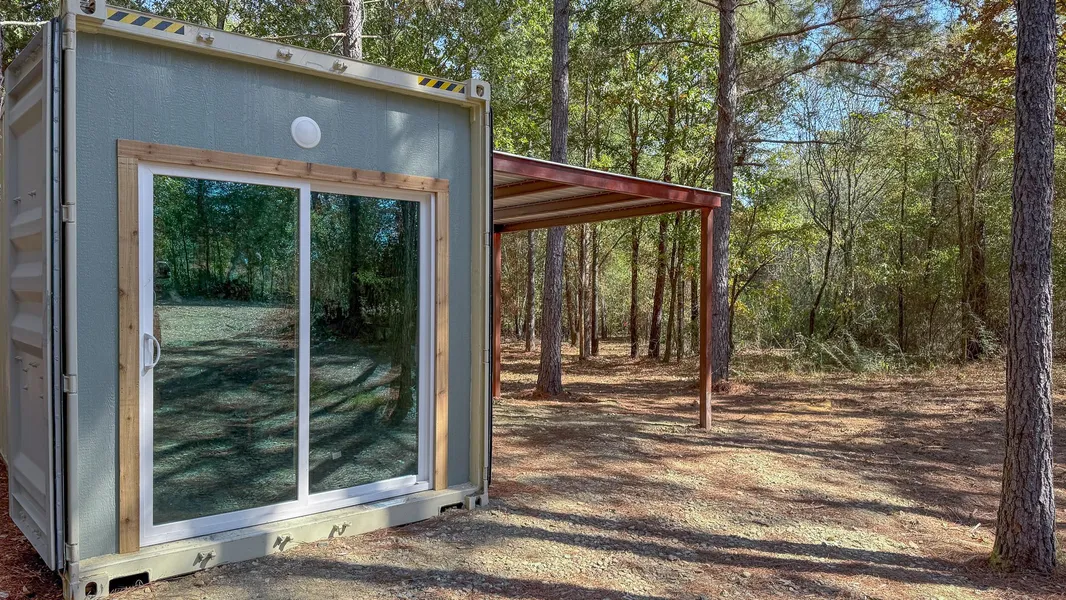 This 41-acre property in Bowie County, Texas, offers a functional mix of improvements and natural features for recreational or residential use. A brand-new shipping container cabin sits on the tract, complete with water, electric, and septic in place. Known for their security and durability, shipping container structures provide efficiency and low maintenance. Inside the cabin, the layout includes a front bedroom, a kitchen with a 30-inch range and refrigerator, a wall-mounted fireplace and TV, a bunk room, and a full bathroom. A large awning extends off the side, offering space for parking or a covered outdoor seating area.