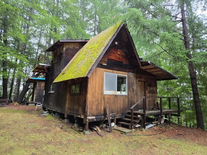 Step into a world of possibility with this quaint cabin, nestled on over 42 acres of breathtaking timberland and open spaces. Fed by fresh spring water, the cabin invites you to create your perfect mountain hideaway. A sunny flat below the home boasts sweeping mountain views, ideal for a peaceful garden. Inside, a cozy wood stove warms the living space, while the sleeping loft and shower offer rustic comfort but no toilet. Kitchen has a sink but no stove or fridge. Though in need of some love, this gem has generator power and endless potential. Embrace mountain living and coastal sunshine. Conventional land loan available.