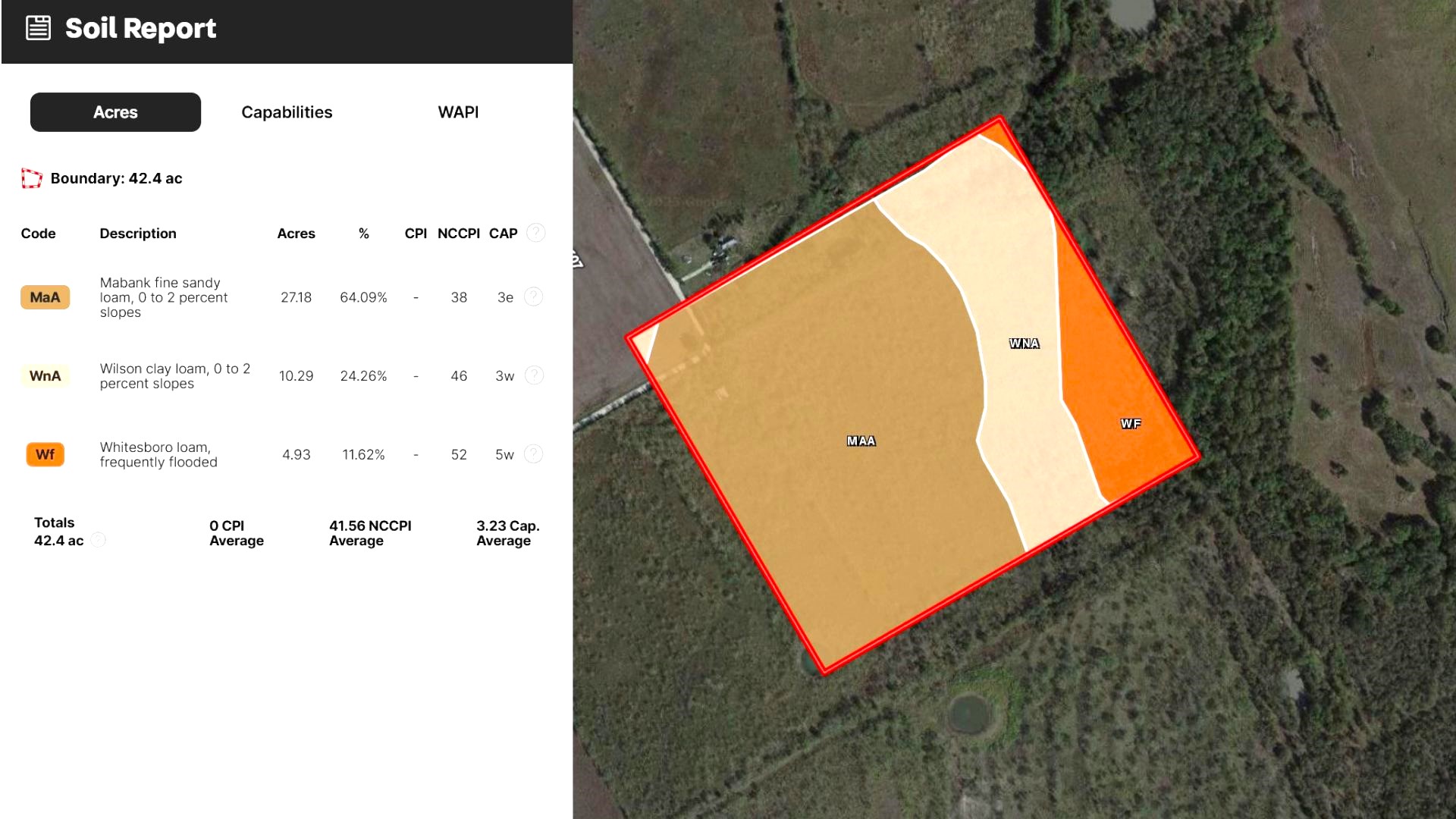 Search for detailed parcel information including; Elevation & Vegetation Maps, Ownership Information, Detailed Parcel Information, Crop History Map, Soil Survey Productivity Data, and more.