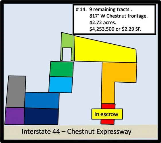 Coldwell Banker Commercial Southwest Partners’ “No Borders Division” has been retained as the listing consultant to Coldwell Banker Commercial Vanguard in Missouri for exclusive representation of “Chestnut Park”. Chestnut Park # 1 has 2.59 acres. It is in escrow at $3.76 SF to the City of Springfield for a new Fire Station. It is expected to fund and close this summer. This offering is for # 14. Entire offering of tracts #2 - # 10. 42.72 acres (1,860,798 est. SF). $4,253,500 or $2.29 SF.