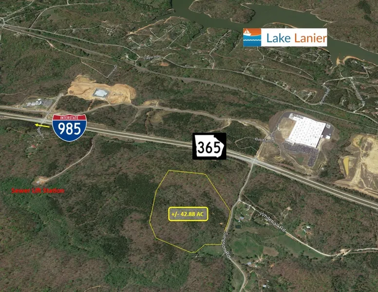 42.88 acres of wooded land with over 700 feet of frontage on Simpson Road. Traffic counts of 31,000 VPD on close-by Hwy 365. This is a unique property due to its 476 AC neighbor which boasts tremendous entitlements. Those include nearly 500,000 Sq.Ft. of Commercial space, 85,000 Sq.Ft. of Office space, 280 apartment units, 30 townhomes and 186 single family residential units. All utilities are available including sanitary sewer gravity line and pump station in place just .5 miles away. Topography is rolling to sloped. Zoned AR-IV. The subject property is located along the rapidly growing I-985 / Highway 365 corridor. Short drive to Gainesville. Unincorporated Hall County Across Street from Hall Co Industry Gateway.