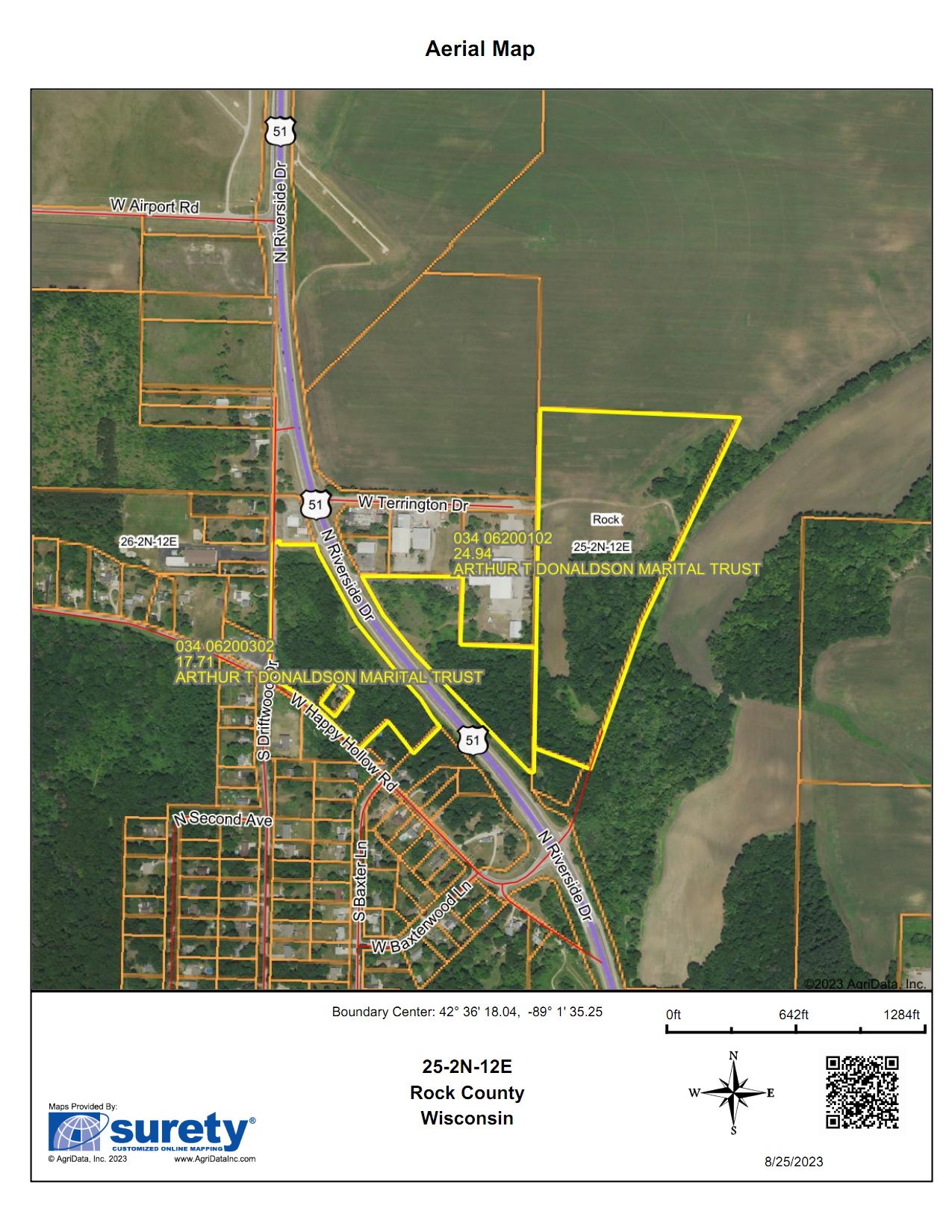 2 miles south of Hwy. 51 & Hwy. 11 Janesville Intersection or 4.5 miles north of Hwy. 51 & Newark Road Beloit Intersection on Hwy. 51. One parcel address is 721 W. Terrington Drive, Janesville, WI and the adjacent parcel lies on both the east and west side of Hwy. 51. Other bordering roads are W. Sherman Road, W. Happy Hollow Road, & S. Driftwood Drive. Watch for signs.