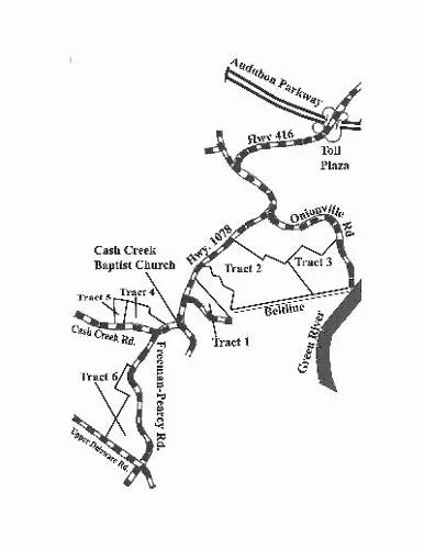• Tract 6 contains 35.46 acres. From Cash Creek Baptist Church take Cash Creek Road .2 mile to Freeman-Pearcy Road and continue on it .8 mile to the property. This is a long narrow rolling tract of land which is all in woods. It has 4456 ft. of frontage on Freeman-Pearcy Road and 815.27 ft. on Upper Delaware Road (KY HWY 520).