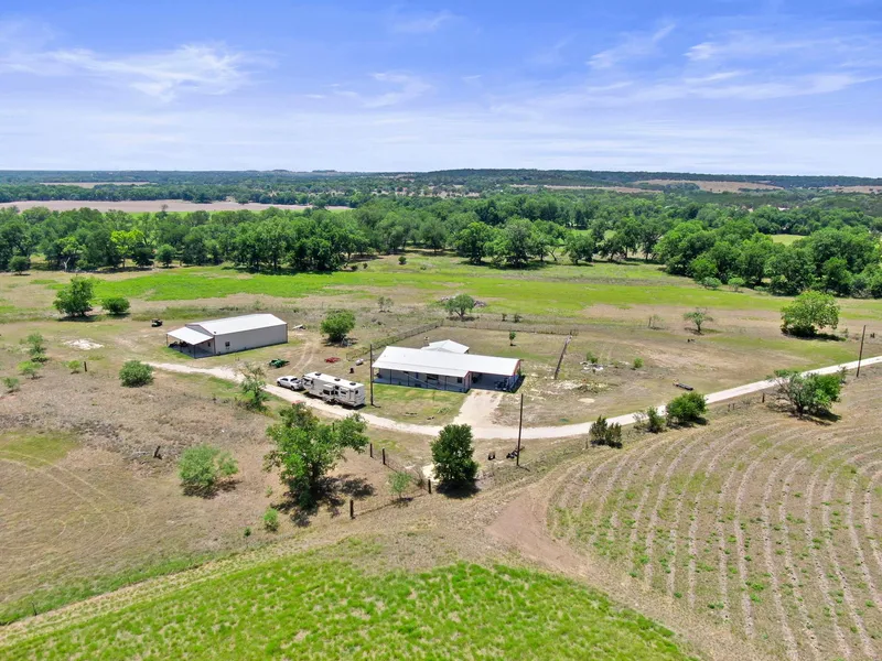 Main house features 2,052 sq.ft.of living space with an open floorplan, stained concrete floors, vaulted ceilings with recessed lighting, ceiling fans, separate dining area, gourmet kitchen with commercial style appliances including: double ovens ( 1 convection), over sized refrigerator/freezer, 5 Star Brand Gas cooktop with 4 burners and a flat top, center island with prep sink, dishwasher, 2 compartment stainless steel sink, granite countertops, ample storage and workspace, pendant lighting and a gorgeous view looking out to a pasture with WW B Dahl Hay. Huge primary bedroom with large walk in closet, soaking tub, separate walk in shower, double vanity and plenty of storage, 2 secondary bedrooms with 1 full bath, laundry room with plenty of workspace, covered front porch with beautiful lighting to enjoy a Texas sunset. Back covered patio with stone fireplace perfect for entertaining. 1,200 sq.ft. Shop with 2 roll up doors, 600 sq.ft. attached guest/mother in law quarters with full kitchen, bath, living room, bedroom and covered patio. Plenty of parking, Electric Hook-up for RV, rolling topography and just a short trip to town!!