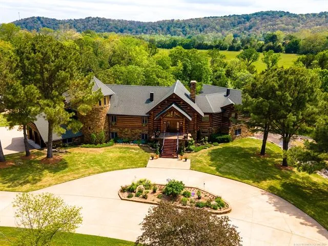 Private Illinois River Waterfront Estate. 6 bed, 4 full, 2 half bath log home w/river frontage & private creek. Security gate, central vac, Sub Zero fridge/freezer, wine cellar, safe room, hardwood, steam sauna, outdoor kitchen & shower, gym, geothermal. Seller related to co-listing Agent.