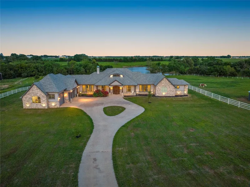 Welcome to Retela Ranch in Whitesboro. This one story modern ranch home is situated on 43 acres (3 tracts of land). Three bedrooms, 2 and 1 half baths, the Primary BR is split from secondary BR's, an office and a Theatre-Media room. The Living room has a wood beam ceiling with gas log fireplace and is open to the kitchen with island, farm sink, gas cooktop, convection oven, microwave. Relax on the 34 ft screened patio overlooking the pasture and ponds. Three car garage. 10 stall barn with custom stall fronts, auto waters, spray foam insulation, office, fully integrated bug and fly spray system, dedicated tack room, separate hay-feed-shavings storage room and hot-cold water shower area. 80x150 Covered riding arena, separate round pen. Fenced and cross fenced, expansive pastures for horses. Three ponds (2 stocked for fishing), duck and dove hunting. Back property has two stall barn and st...