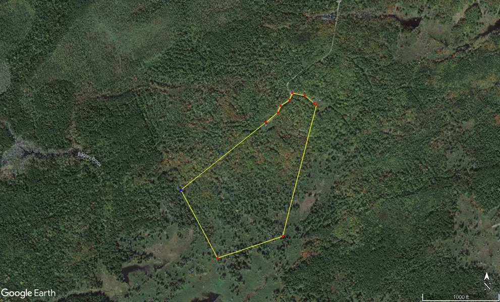 44.3 surveyed remote and off grid acres near the bold coast of Downeast Maine. This property is about two miles from a public year round road and is a dead end and quiet location.